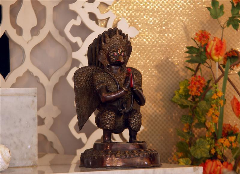 Garuda stands at the back of the temple room, ready to carry the predominating deities to any destination they desire. It is on his wings they travel, not because they need them, but because of his desire to be of service to them in this manner. He is strong, powerful, undefeatable, and always ready to protect his lords. He is ready to assist those who desire to perform service to his deity.